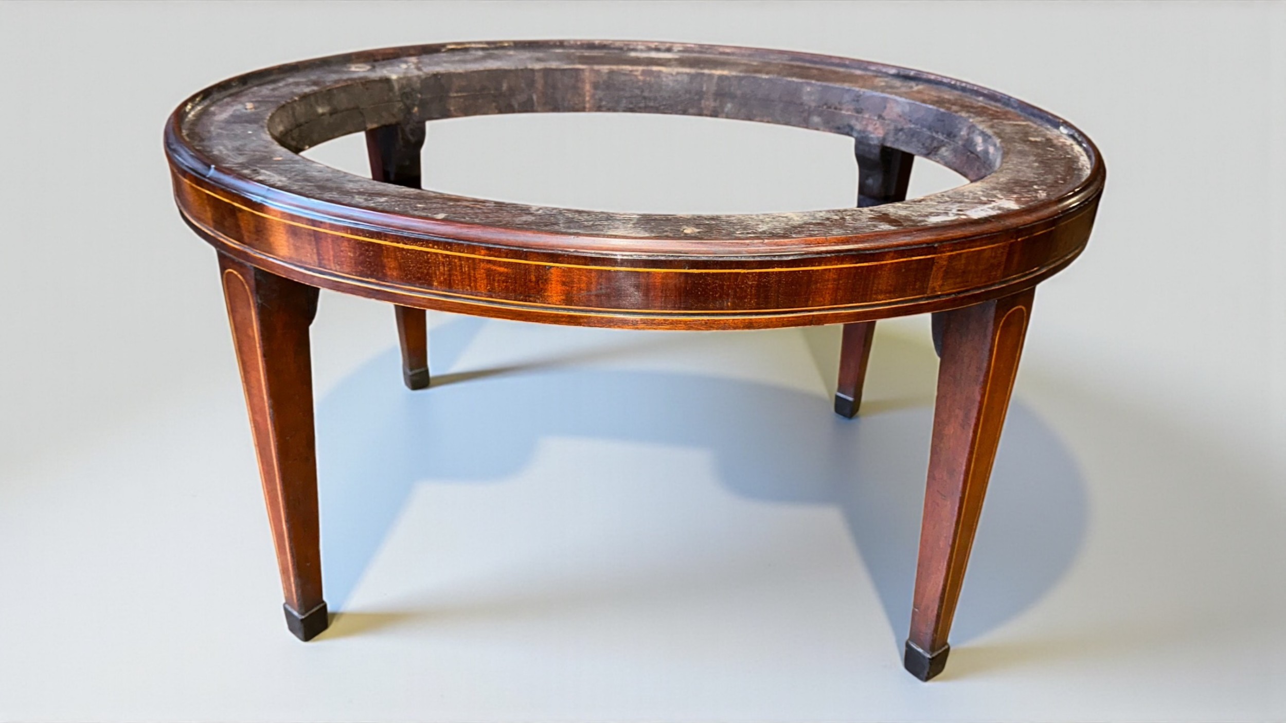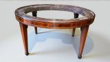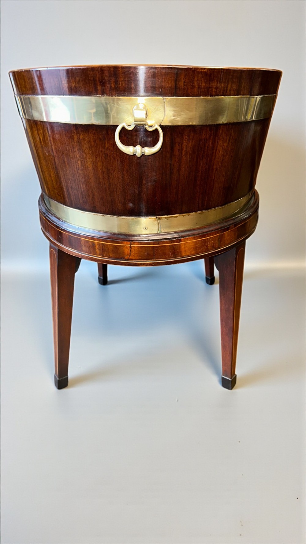 A George III Mahogany & inlaid oval wine cooler. Inlaid throughout with boxwood stringing. The detachable stand with square tapering legs ending in ebonised block feet. Circa 1800 I have been established as a dealer and antique furniture restorer for almost 20 years. I have a real love and passion of fine 18th and early 19th century furniture. As a professional restorer I am always searching for the finest quality and original items but should any restoration be nessesary it will be sympathetically and skilfully carried out in house by myself. If items are purchased with buy now option I shall do my very best to work with my courier to offer free delivery within most of UK mainland. (Some exclusions to locations may apply) It has been noted that the system is rounding up measurements added in cm to the next nearest inch so if dimensions are critical for a particular space please work by the cm size listed of please ask.