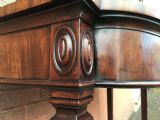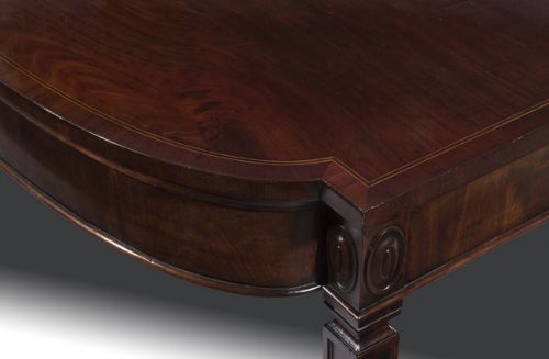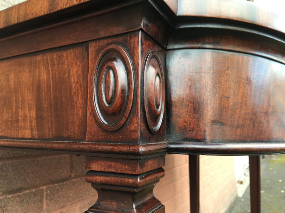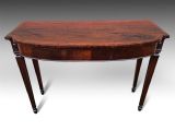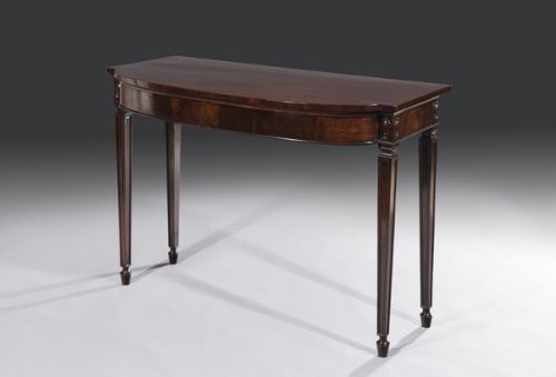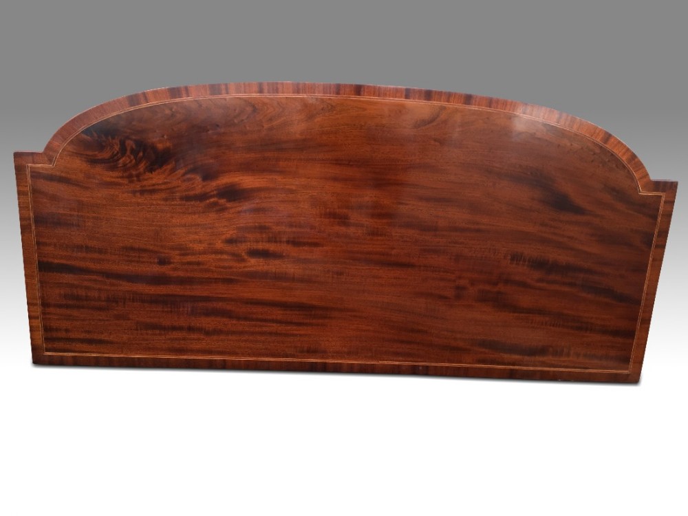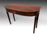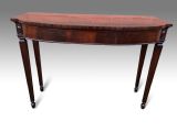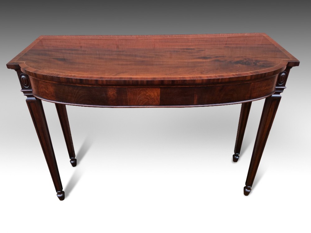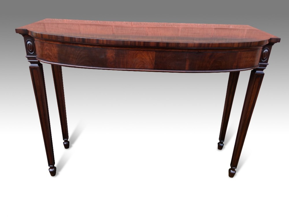 This striking bow-fronted mahogany serving table has a cross banded edge with boxwood & rosewood inlay.