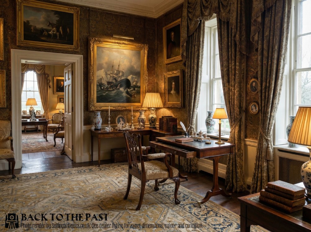 A fine Regency mahogany & Ebony writing table in the manner of Marsh & Tatham. The black leather lined top with a matching concealed writing slide in the fitted stationary drawer. Dummy drawer to the rear. The well shaped legs & standard ends with original brass toes & castors. Marsh & Tatham ( subsequently Tatham, Bailey & Sanders) was a partnership between William Marsh ( active 1775-1810) and Thomas Tatham 1763-1810 of a very successful firm of cabinet makers & upholsters based in Mount Street, Mayfair, London. They carried out major commissions for the Prince of Wales at the Royal Pavillion, Brighton among other imports Clients. I have been established as a dealer and antique furniture restorer for almost 20 years. I have a real love and passion of fine 18th and early 19th century furniture. As a professional restorer I am always searching for the finest quality and original items but should any restoration be nessesary it will be sympathetically and skilfully carried out in house by myself. If items are purchased with buy now option I shall do my very best to work with my courier to offer free delivery within most of UK mainland. (Some exclusions to locations may apply) It has been noted that the system is rounding up measurements added in cm to the next nearest inch so if dimensions are critical for a particular space please work by the cm size listed of please ask.