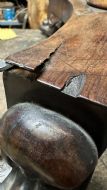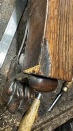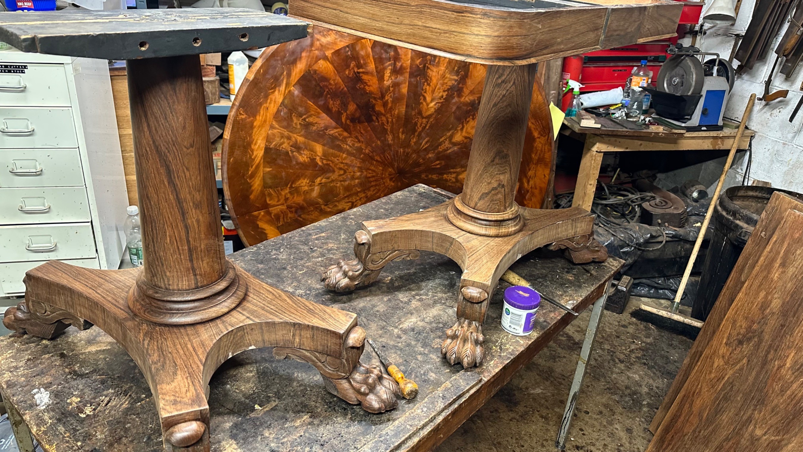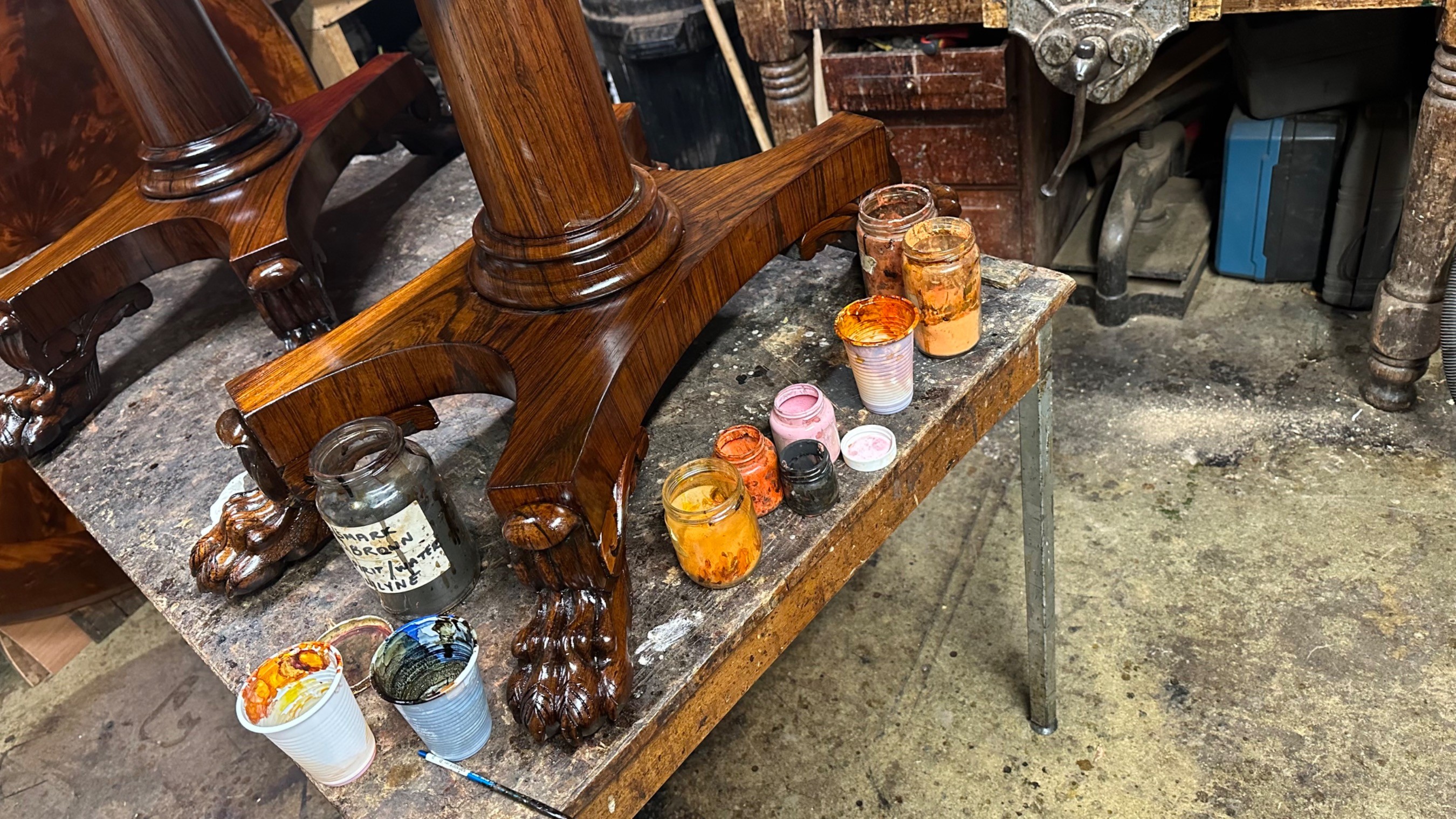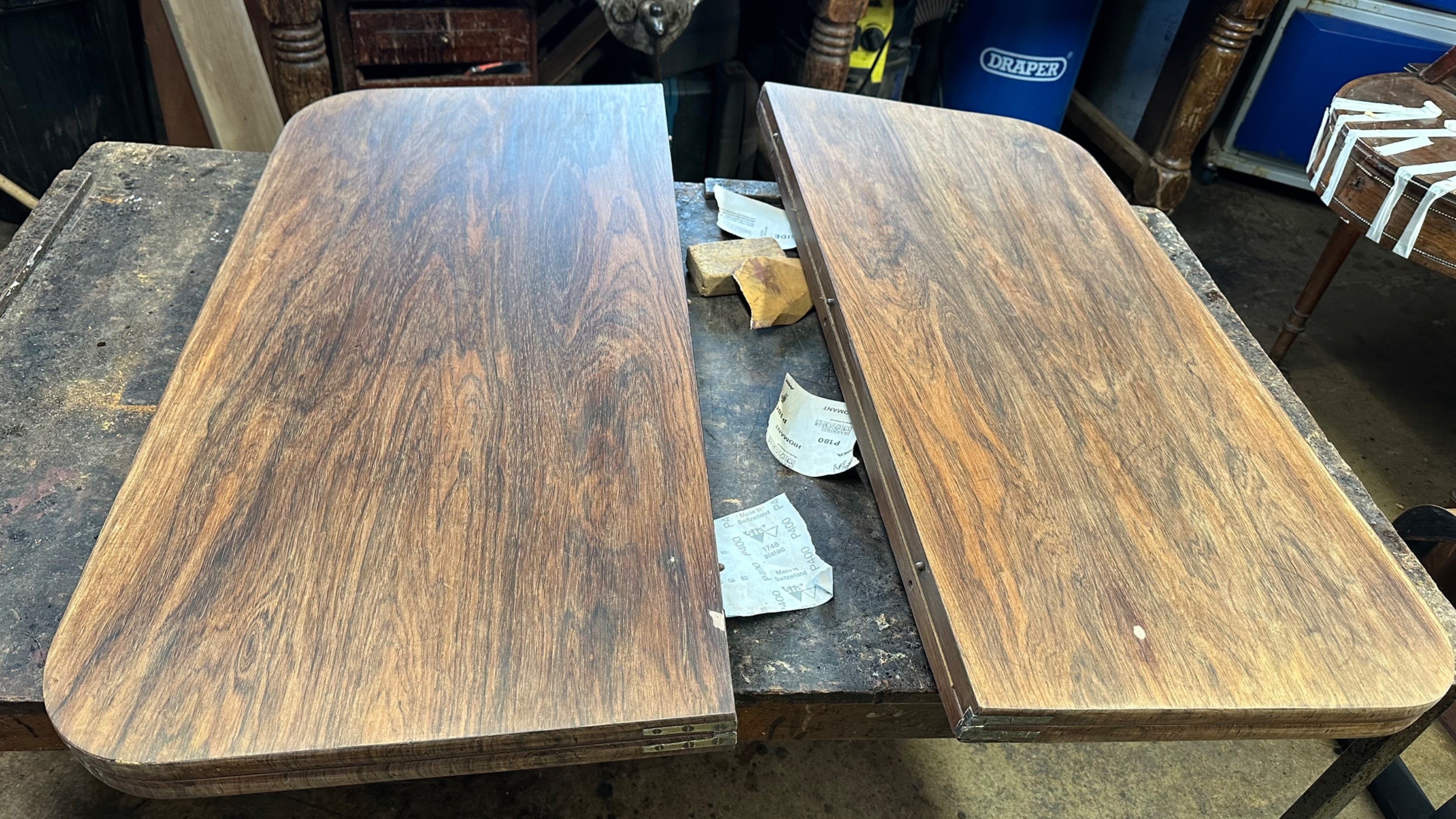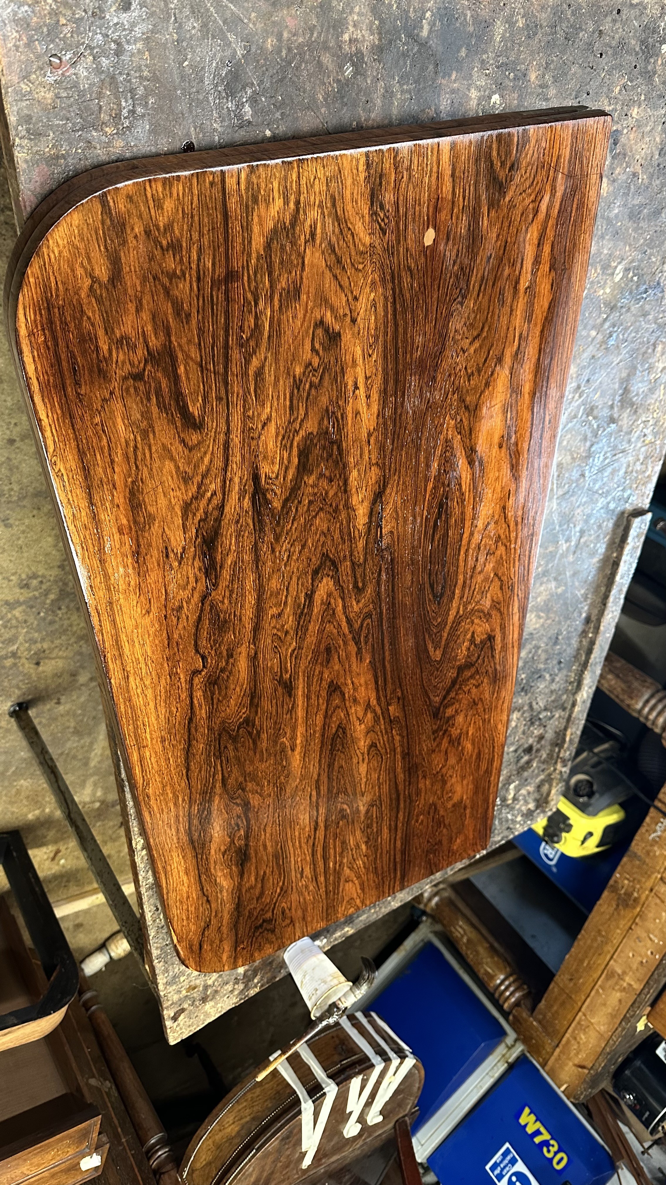 There was extensive damage to the veneers which were lifting so required gluing & patching. Due to previous bad restoration the tops required bleaching as the lovely mellow colour much loved in rosewood had been sanded right though resulting in deep black areas. When the patches were all leveled the surfaces were stripped then the tables traditionally hand French polished with special pale polish then when built up with a full grain left to harden for a week was then dulled & wax polished resulting in a nice mellow finish.