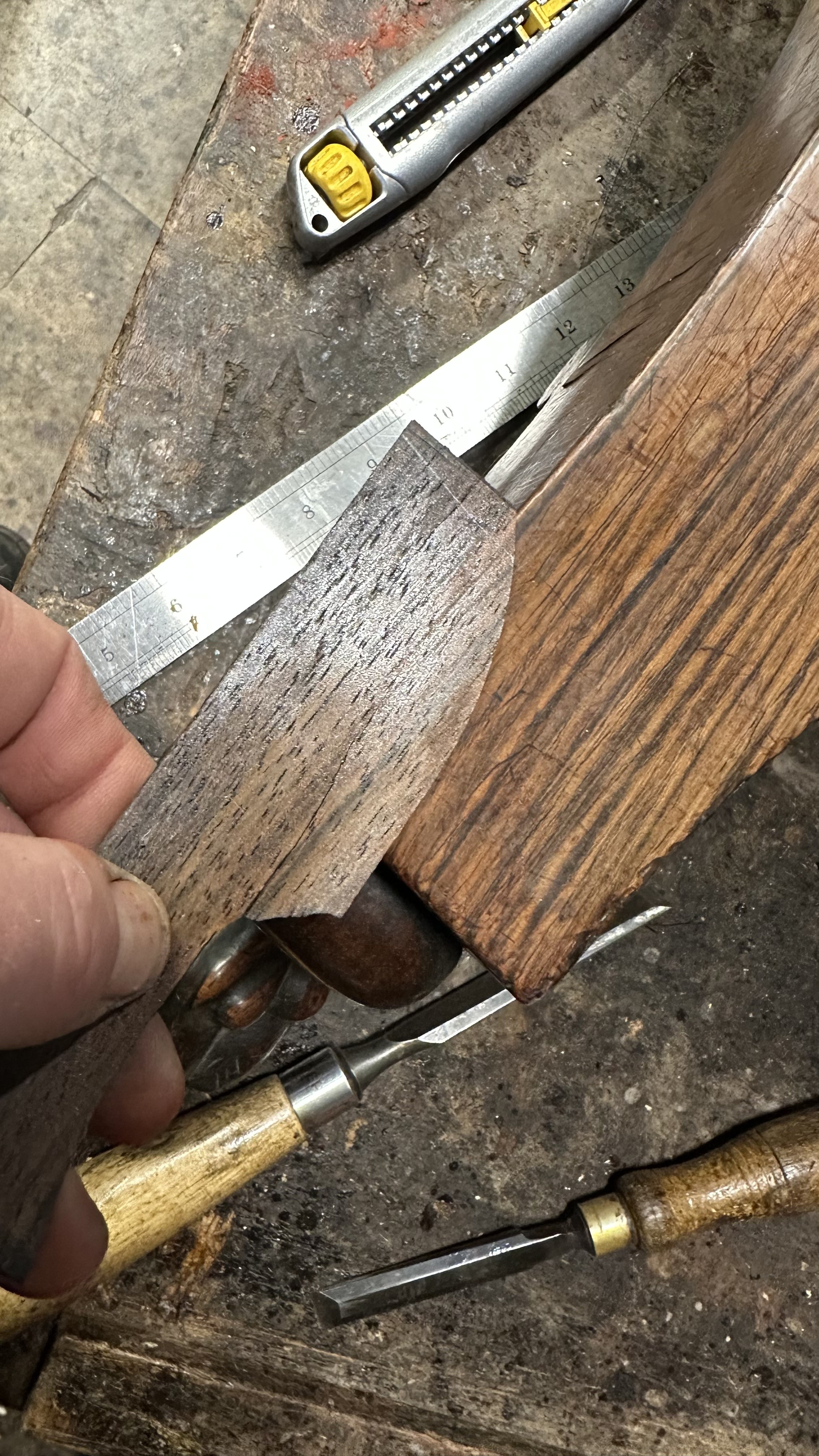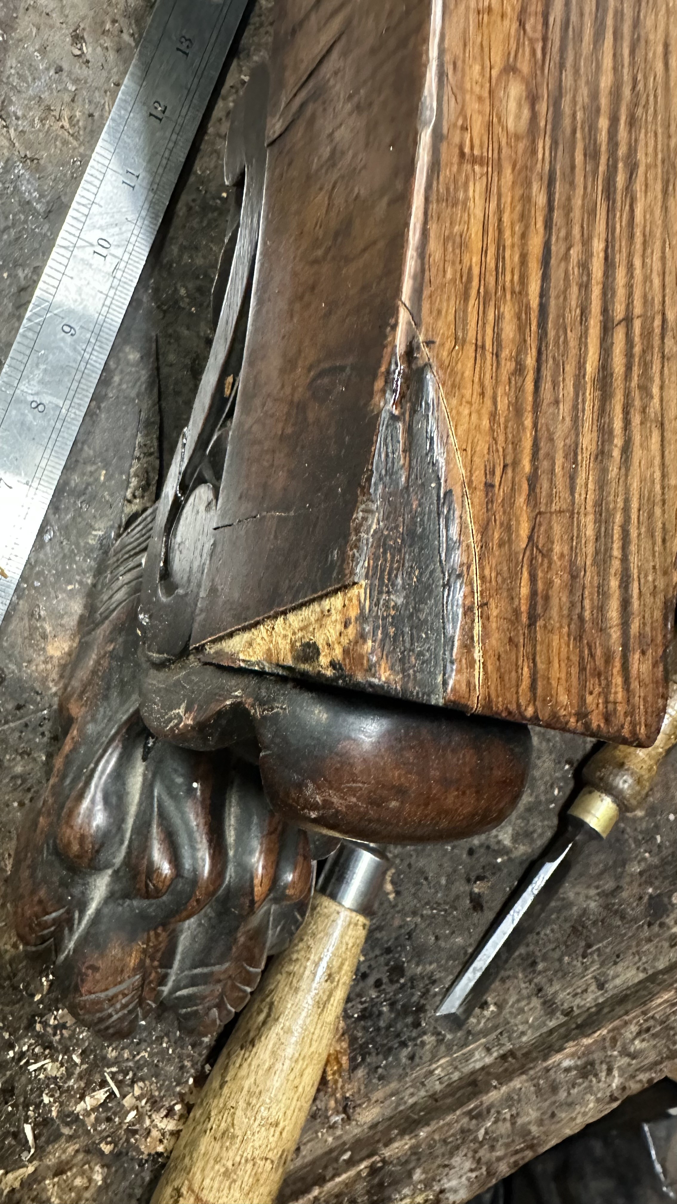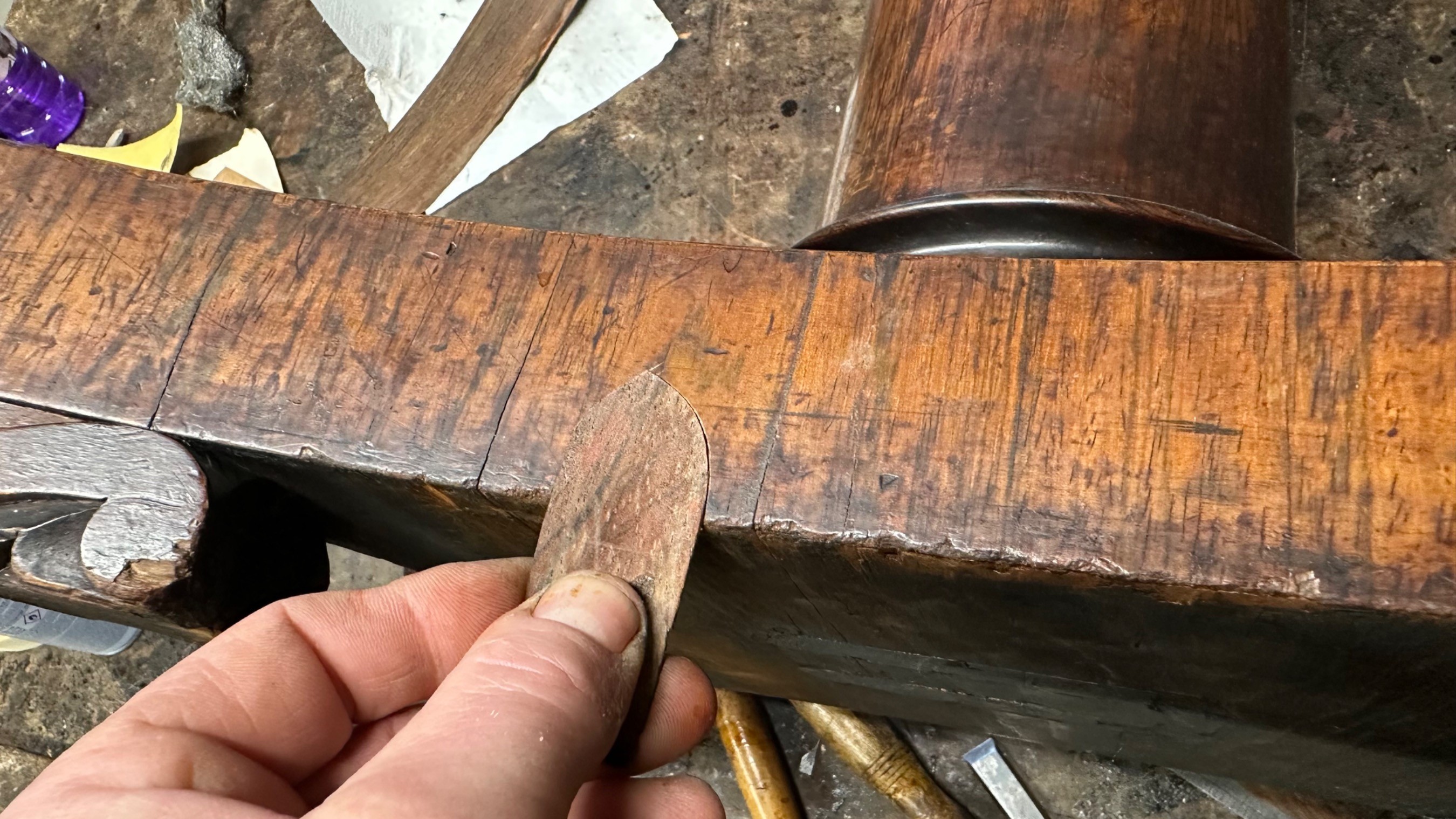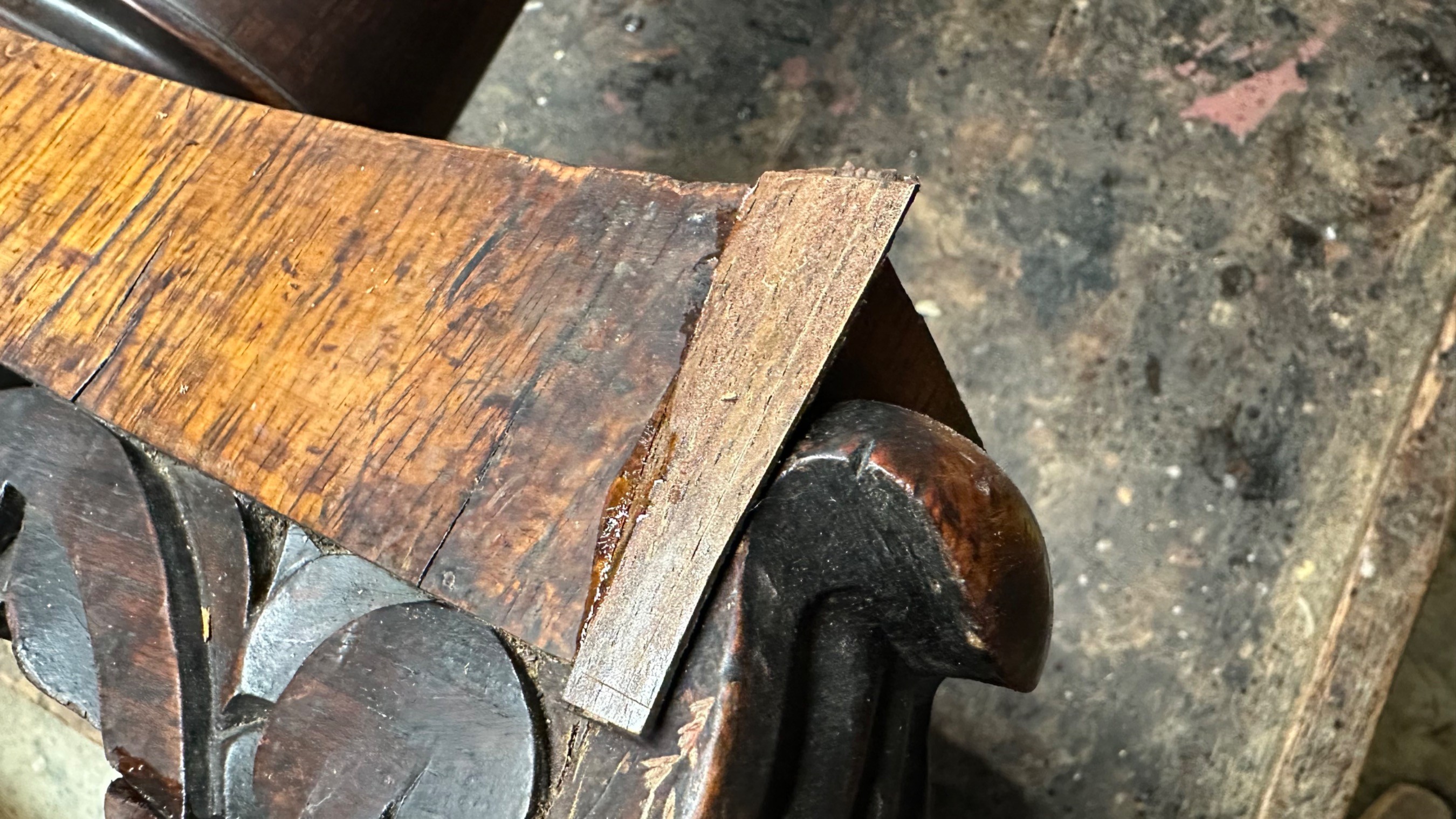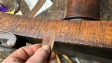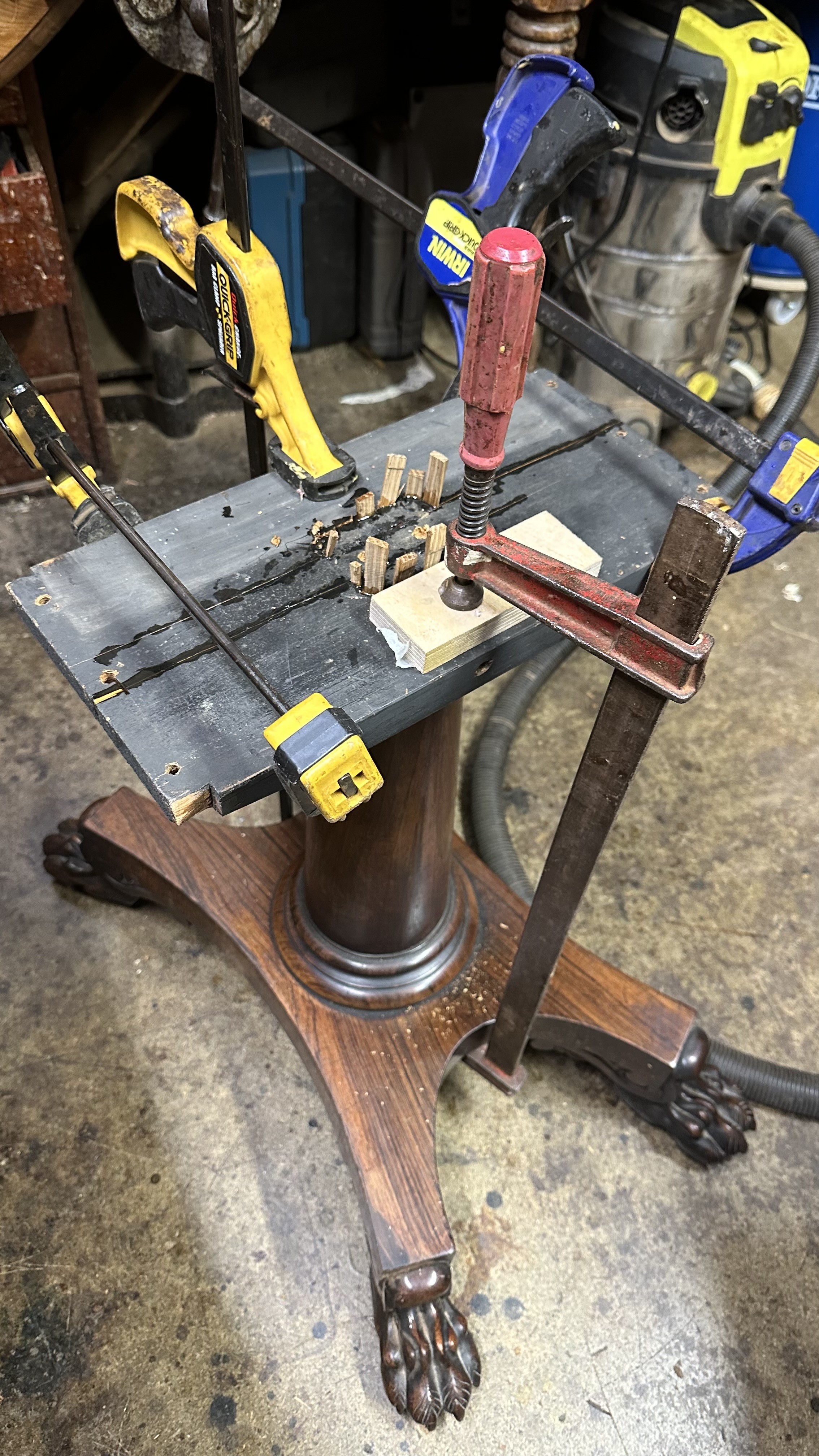 There was extensive damage to the veneers which were lifting so required gluing & patching. Due to previous bad restoration the tops required bleaching as the lovely mellow colour much loved in rosewood had been sanded right though resulting in deep black areas. When the patches were all leveled the surfaces were stripped then the tables traditionally hand French polished with special pale polish then when built up with a full grain left to harden for a week was then dulled & wax polished resulting in a nice mellow finish.
